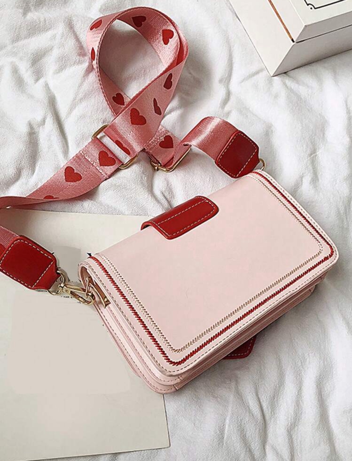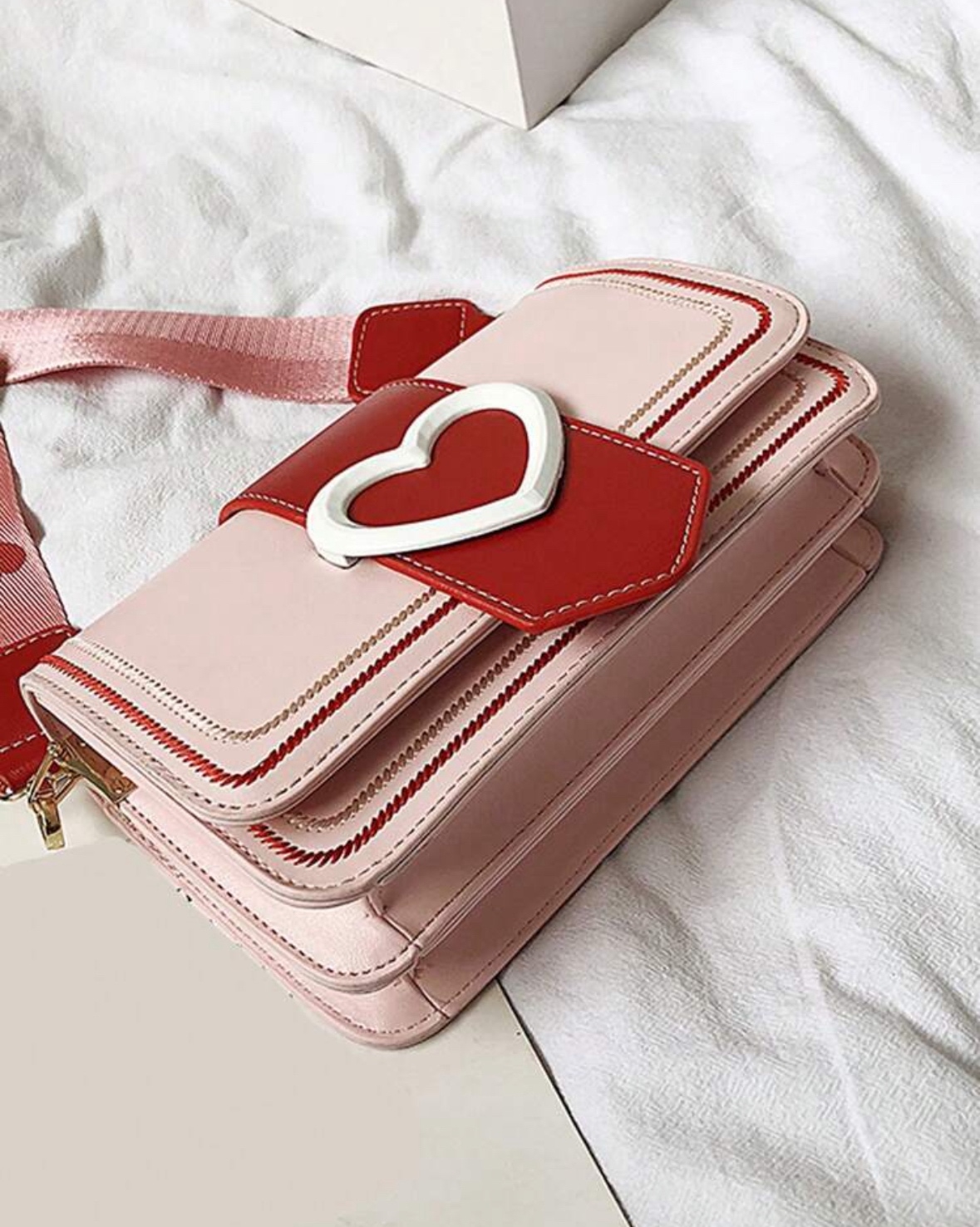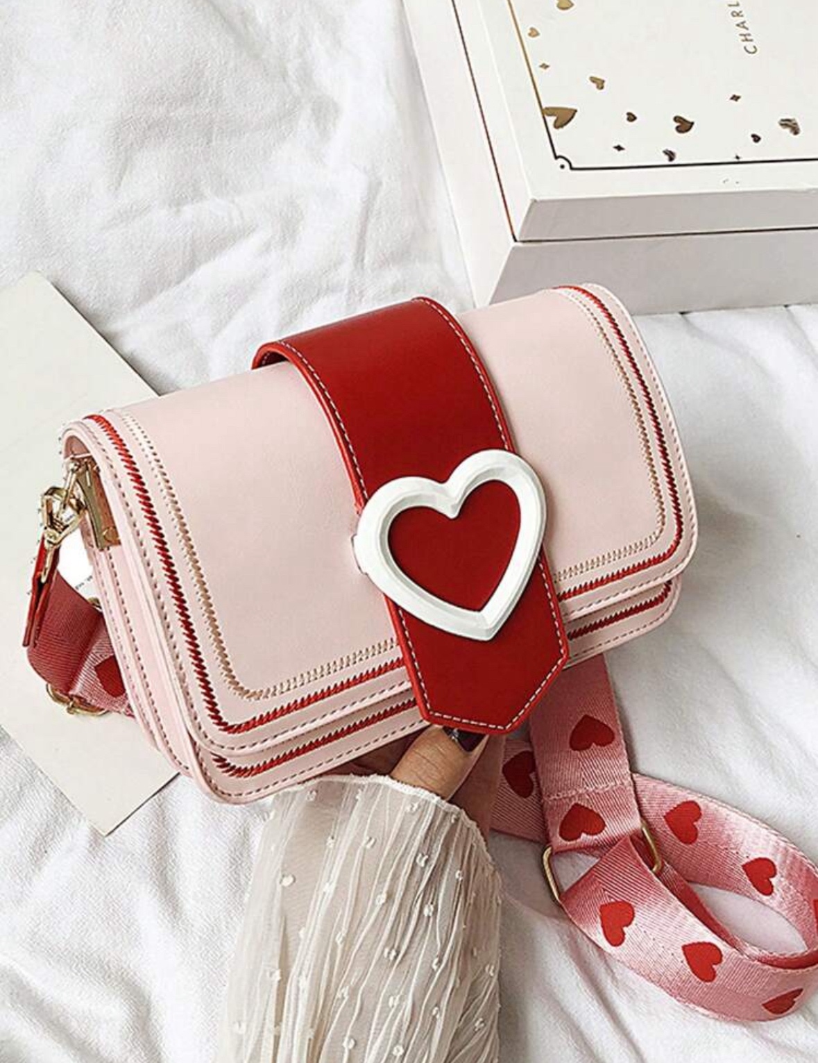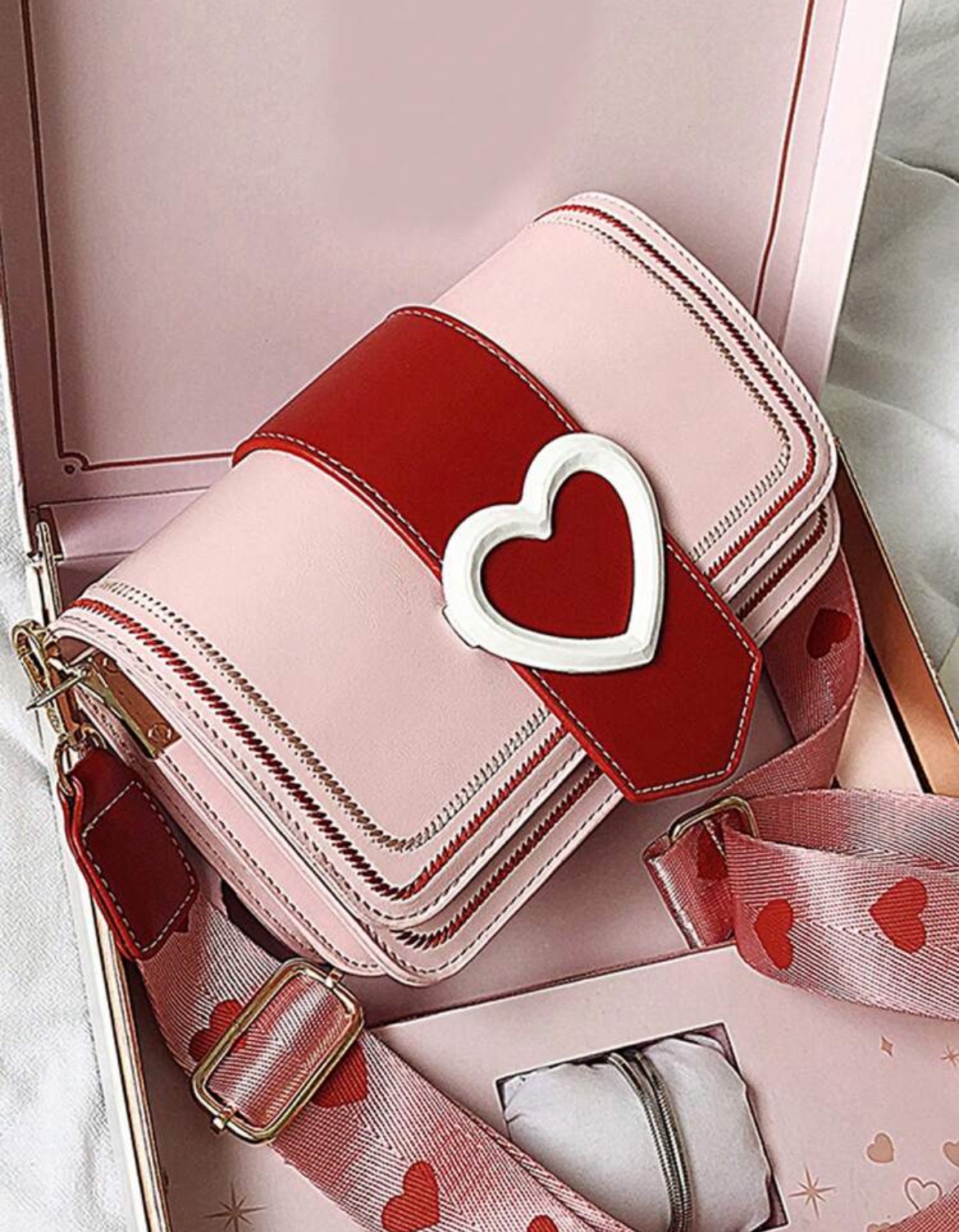 Чанта Любовно писмо впечатлява с изтънчен и същевременно забележим дизайн. Мекото розово създава усещане за нежност и романтика, а наситеночервените елементи добавят страст, характер и дълбочина. Централният акцент е красиво оформено сърце в бяло, което придава уникалност и прави модела незабравим.