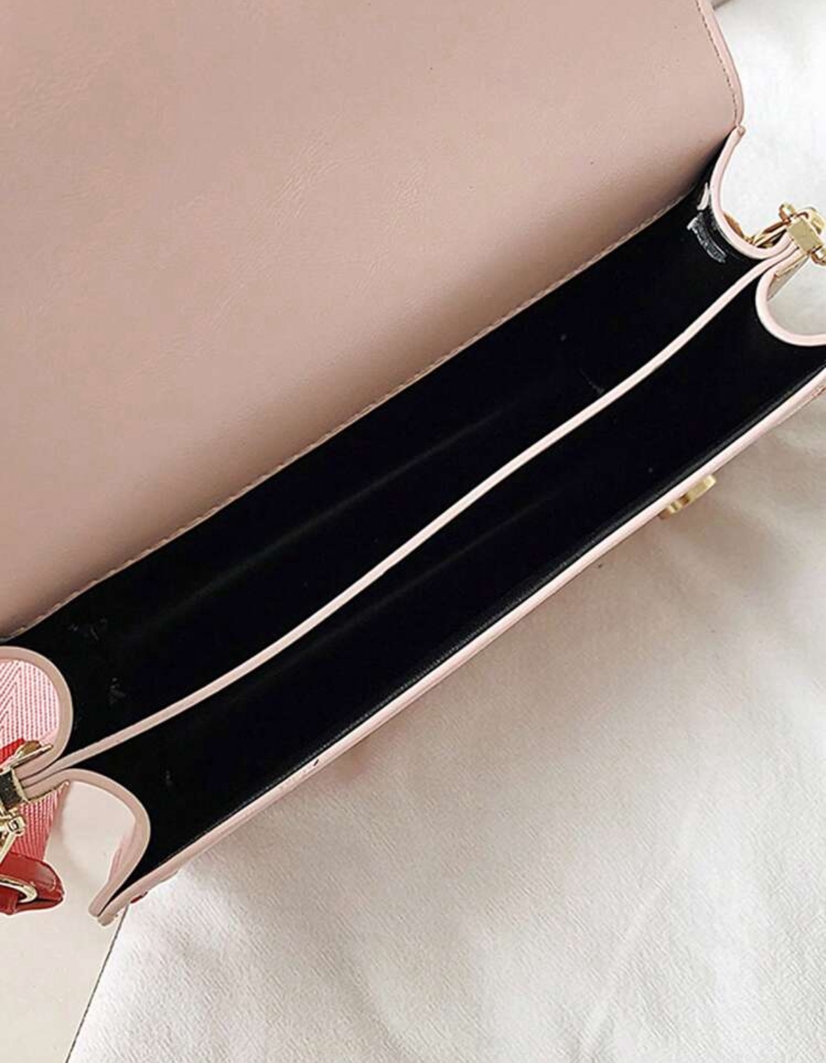 Широката декоративна червена лента, която преминава през средата на чантата, е стилен детайл, придаващ структура и подчертаващ прецизната изработка. Това е аксесоар, който ще грабне вниманието още от пръв поглед — нежен, но категоричен, изискан, но закачлив.
