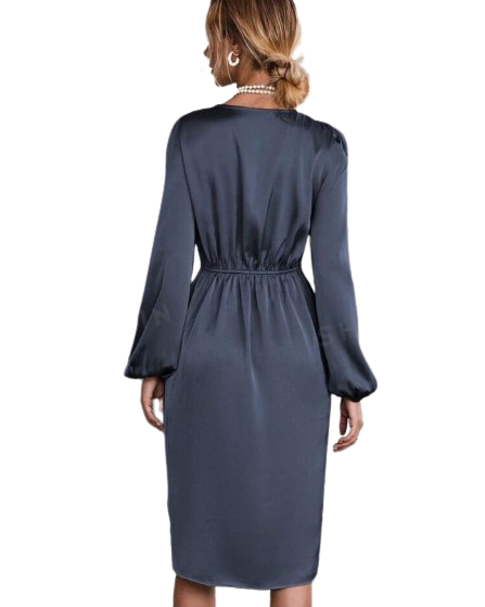 Сатенената рокля тип „Прегърни ме“ в цвят Navy blue е идеалният избор за жените, които искат да съчетаят комфорт и стил в едно. Тази рокля е универсална, елегантна и подходяща за различни поводи – от официални събития до по-непринудени срещи.
